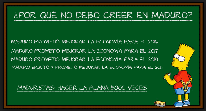 Esta caricatura es ideal para hoy día del maestro. El camisa roja Bart Simpson va castigado a la pizarra por creer en las promesas de Maduro año tras año.