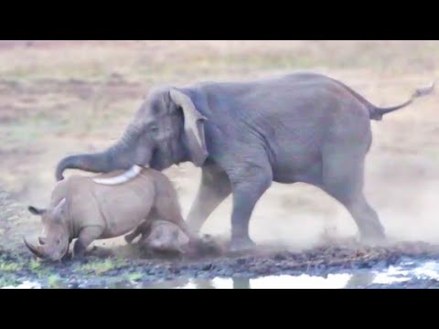 Un elefante arremete contra un rinoceronte y su cría. Si alguna vez te habías preguntado quién ganaría entre estas dos bestias, pues aquí tienes.