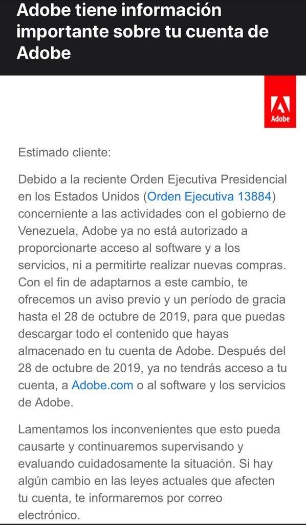 En un comunicado enviado a sus clientes, Adobe informó que ya no estará autorizada a proporcionarles acceso al software y a los servicios, ni a permitirles realizar nuevas compras. “Con el fin de adaptarnos a este cambio, te ofrecemos un aviso previo y un período de gracias hasta el 28 de octubre de 2019 para que puedas descargar todo el contenido que hayas almacenado en tu cuenta de Adobe. Después del 28 de octubre de 2019, ya no tendrás acceso a tu cuenta, a adobe.com o al software y los servicios de adobe”, añade la empresa en el comunicado.
