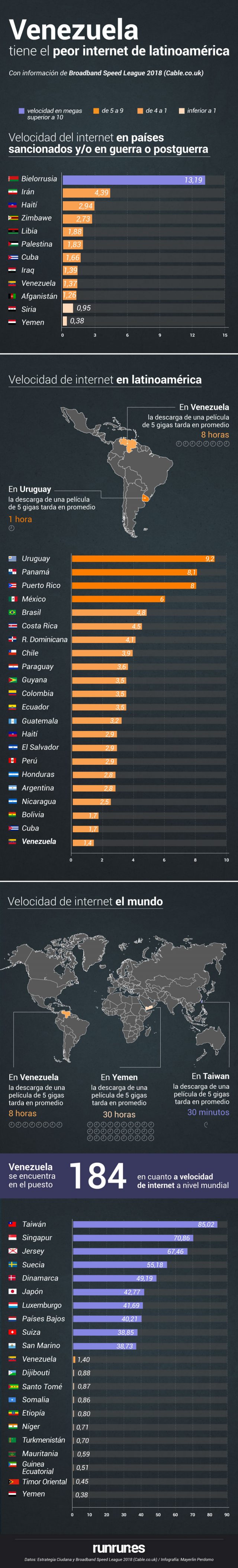 Basándose en los datos del 2018 proporcionados por Broadband Speed League, el informe revela que Venezuela se ubica en el puesto 184 en cuanto a velocidad de internet, con 1,37 megas. En el contexto de países sancionados o en guerra, se encuentra por detrás de Cuba con 1,66 megas y de Iraq con 1,39 megas; y detrás de Venezuela se ubican Afganistán con 1,26 megas, Siria con 0,95 y Yemen con 0,38.