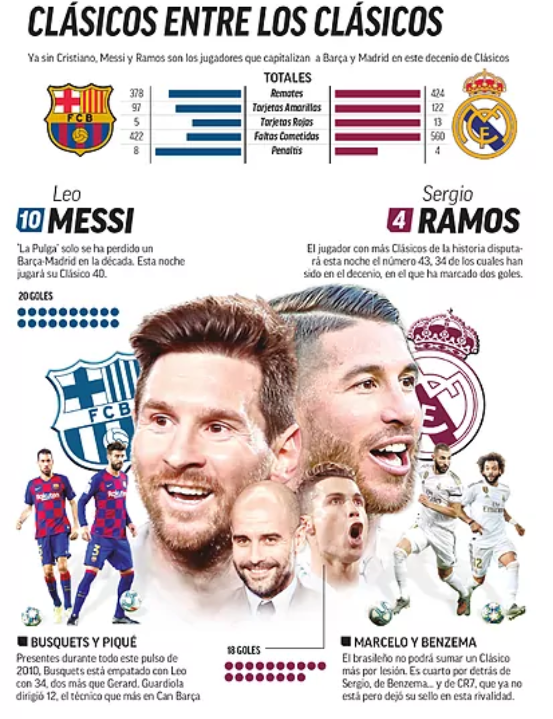 La historia del decenio se escribe a partir de nombres propios, Mourinho y Guardiola al inicio de los 2010, Zidane y Valverde para los finales, con el hilo conductor de los goles de Cristiano Ronaldo y Messi, ausente el primero, permanente amenaza el segundo, más jugadores imprescindibles y supervivientes en uno y otro lado, capitanes como Ramos, Marcelo y Benzema de lado blanco, Busquets y Piqué de lado azulgrana.