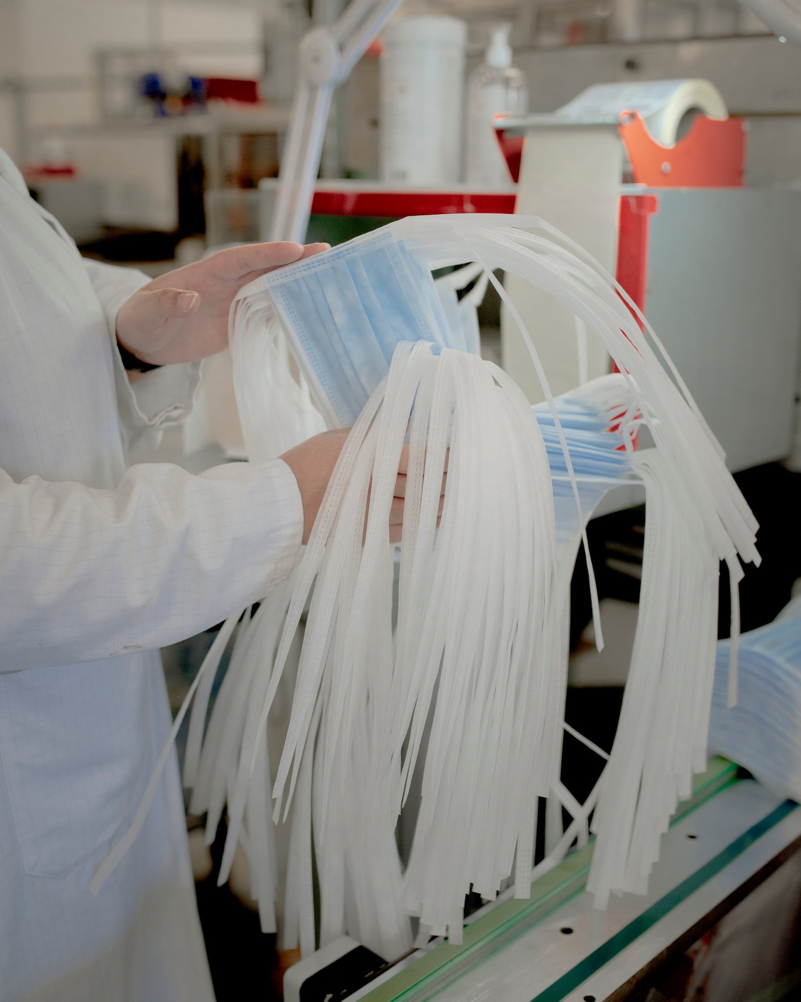 La fábrica, que se encuentra en Angers, por lo general fabrica alrededor de 170 millones de cubrebocas quirúrgicos anualmente, pero en la última semana ha recibido pedidos por la asombrosa cantidad de 500 millones, lo que saturó los buzones del departamento de venta con un pedido cada minuto o dos. Kolmi Hopen se está apresurando a contratar a más trabajadores para mantener las máquinas funcionando las veinticuatro horas del día, los siete días de la semana.