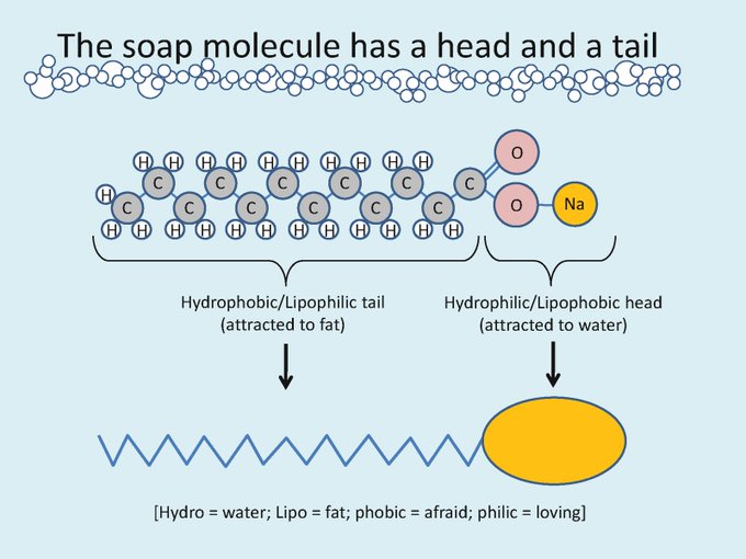 Las moléculas de jabón están formadas por una «cabeza» que atrae al agua, y una «cola» que atrae a la grasa.