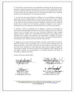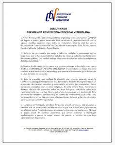 «Ante la gravedad que conlleva la situación que estamos pasando, desde la Conferencia Episcopal Venezolana, se está tomando la decisión de posponer todas las actividades de carácter formativo y catequético, así como las procesiones, fiestas patronales, peregrinaciones y actos religiosos. En esta misma linea tomamos la dolorosa decisión de suspender todos los actos litúrgicos, incluida la celebración eucarística, hasta nuevo aviso.»