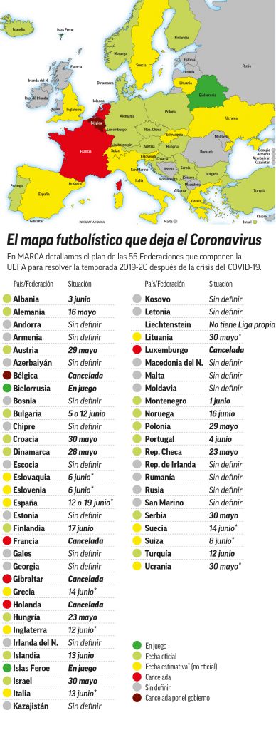 Francia, Holanda y Luxemburgo ya han cancelado la temporada -a Bélgica sólo le falta el OK de la Asamblea- y Bielorrusia, en cambio, nunca paró. También hay fútbol, desde el 9 de mayo, en las Islas Feroe. «Se jugó sin público en las gradas y sin los saludos protocolarios, pero con mucha normalidad. Hubo entradas fuertes, broncas… Además, había desinfectante en las esquinas para que todo el mundo pudiera limpiarse las manos», asegura Pedro Tarancón, español del Argja Bóltfelag.