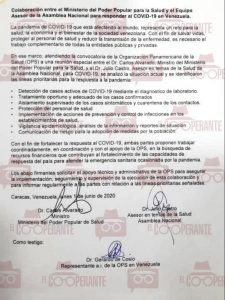 El documento está suscrito por el Dr. Carlos Alvarado, ministro de Salud de Nicolás Maduro; y por el Dr. Julio Castro, asesor en temas de la salud del presidente encargado, Juan Guaidó.