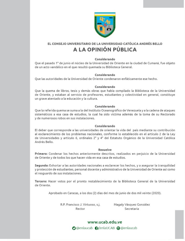 El Consejo Universitario de la UCAB también repudió el hecho y exigió a las autoridades una investigación y que el suceso no quede impune.