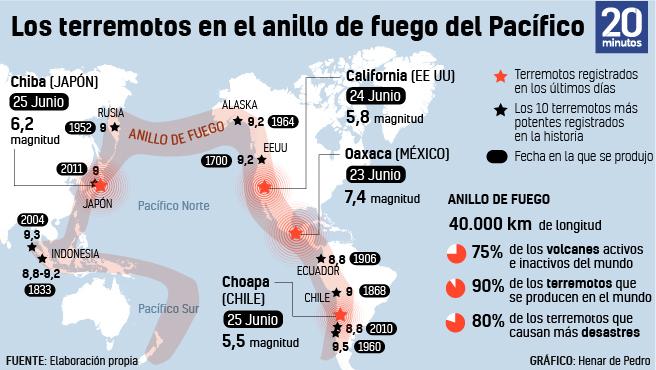 Y es porque están situadas en el Cinturón o Anillo del Pacífico, una franja de 40.000 kilómetros que bordea el Océano Pacífico, donde se producen el 90% de los terremotos de todo el planeta, y la mayoría de los más desastrosos, según recoge el portal de noticias 20minutos.es.