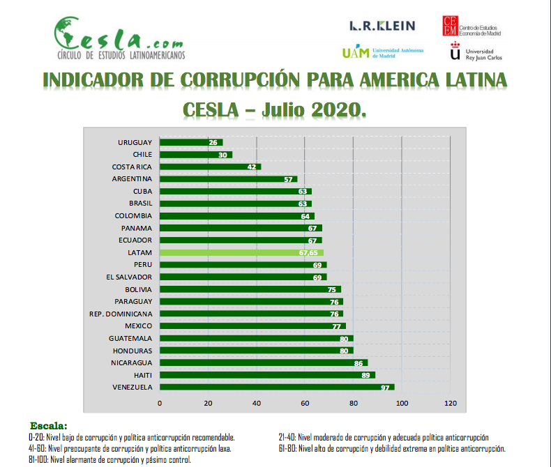 La media (67,65) del indicador de Corrupción CESLA, elaborado para los países de América Latina, presenta en 2020 un repunto marginal, respecto de 2019. Si bien en la región los países más eficaces continúan siendo Uruguay, Chile y Costa Rica, hay que destacar los avances significativos (entre 5 y 7 puntos) que han presentado Argentina, Brasil, Colombia y Ecuador», detalla el estudio.