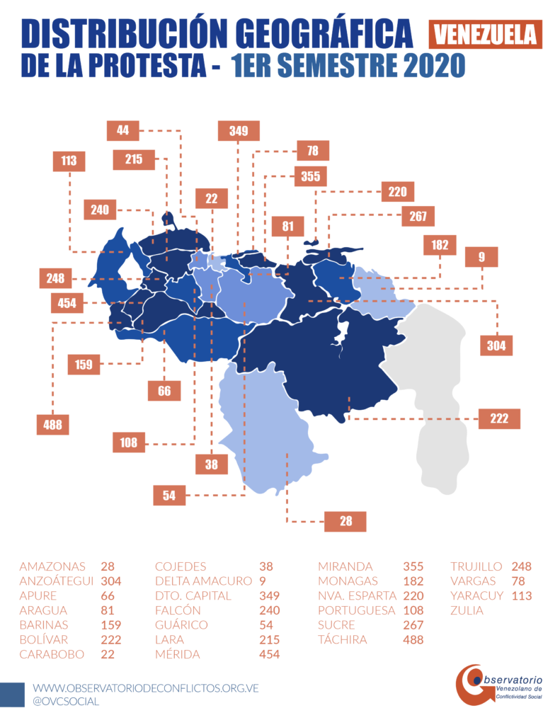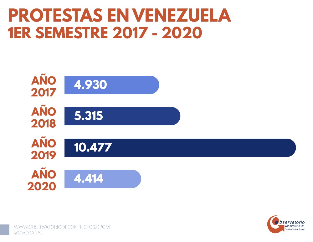 El Observatorio Venezolano de Conflictividad Social (Ovcs) documentó 4.414 protestas durante el primer semestre de 2020. Esta cifra equivalente a un promedio de 25 manifestaciones diarias. Más de la mitad fueron por las fallas en los servicios básicos.