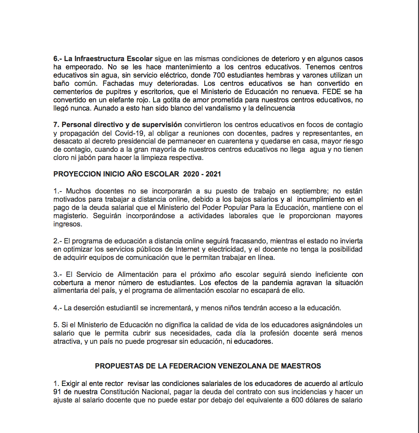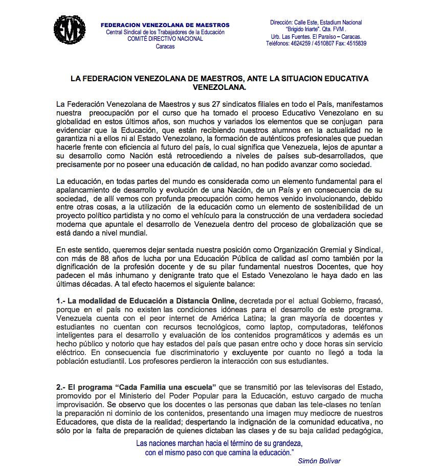 La Federación Venezolana de Maestros y sus 27 sindicatos filiales en todo el País, manifestó su preocupación por el curso que ha tomado el proceso educativo venezolano y sobre todo la educación a distancia implementada por el régimen a raíz de pandemia de coronavirus.