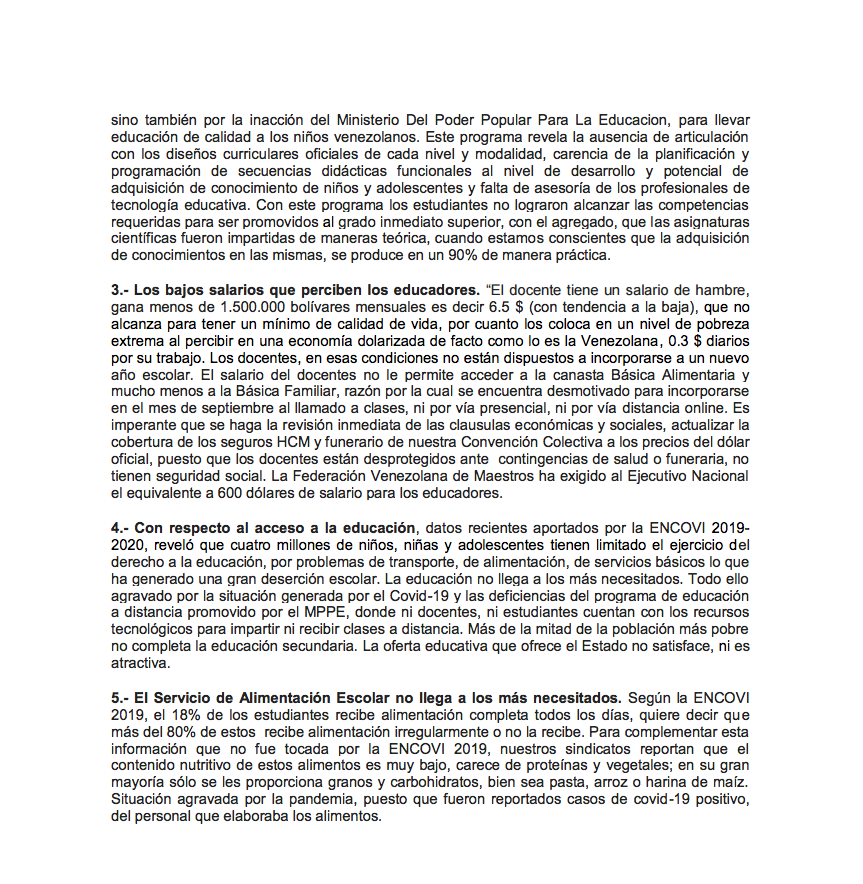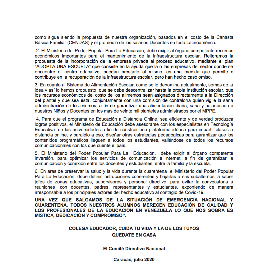 Debido a las dificultades hubo durante los meses de confinamiento, para que los niños recibieran educación de calidad y ante la posibilidad de ese modelo en línea se mantenga, por el aumento de casos de COVID-19, los maestros emitieron un comunicado en el cual afirman que «la educación a distancia fracasó» y aseguran que tanto niños y maestros no pueden volver a este sistema, sin que antes se cumplan con varias condiciones.