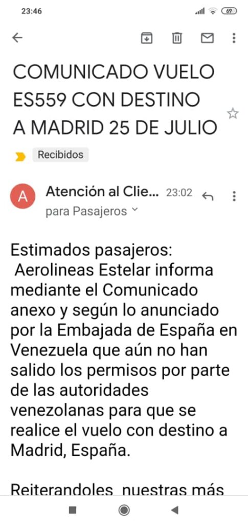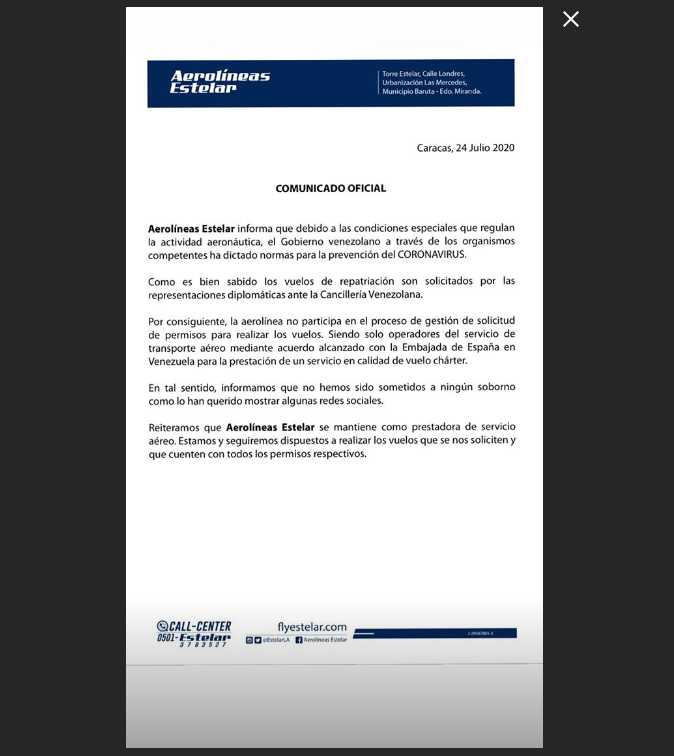 El comunicado remitido a los clientes decía: «Estimados pasajeros: Aerolíneas Estelar informa mediante el Comunicado anexo y según lo anunciado por la Embajada de España en Venezuela que aún no han salido los permisos por parte de las autoridades venezolanas para que se realice el vuelo con destino a Madrid, España».