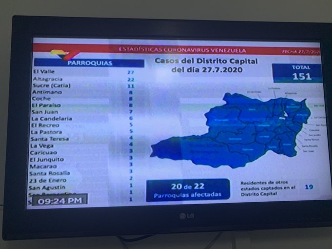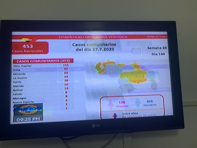 De los casos comunitarios, Rodríguez informó que Distrito Capital Zulia y Miranda encabezan la lista de entidades con la mayor cantidad de contagios: 151 en el Distrito Capital, 97 en Zulia, 69 en Miranda, 44 en La Guaira, 38 en Sucre, 16 en Mérida, 14 en Bolívar, 8 en Falcón, 8 en Monagas, 4 en Nueva Esparta, 3 en Aragua y 1 en Táchira.