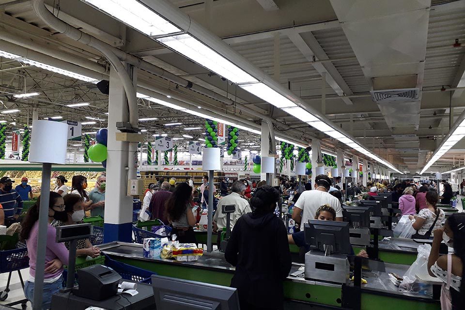 Lo primero que el comprador ve es una cabina de desinfección, para posteriormente encontrarse con montañas de productos que conoce muy bien: el arroz Mary, la tradicional Harina PAN y la margarina Mavesa, fabricados por el mayor conglomerado productor de alimentos del país, Polar, con casi 70 años de arraigo.