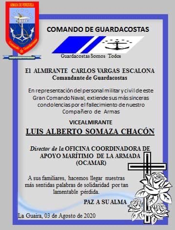 El 3 de agosto fallece el Vicealmirante Luis Alberto Somaza Chacón, de la promoción “Capitán de Navío Juan Danels”, quien era Director de la Oficina Coordinadora de Apoyo Marítimo de la Armada (OCAMAR). Aunque oficialmente no se informó la causa de muerte, familiares del oficial, oriundo de Palmira, municipio Guásimos del estado Táchira, dijeron que el alto oficial falleció en horas de la mañana en Valencia, estado Carabobo.