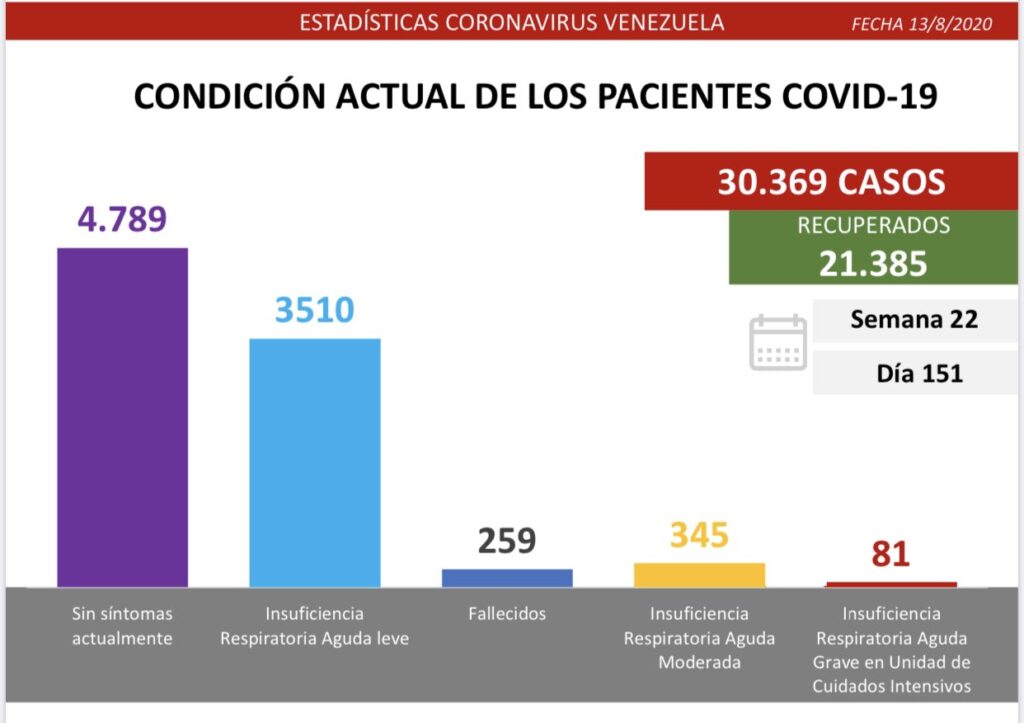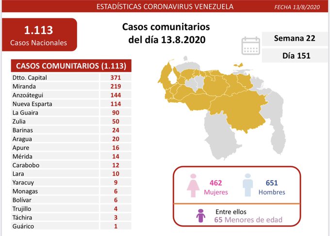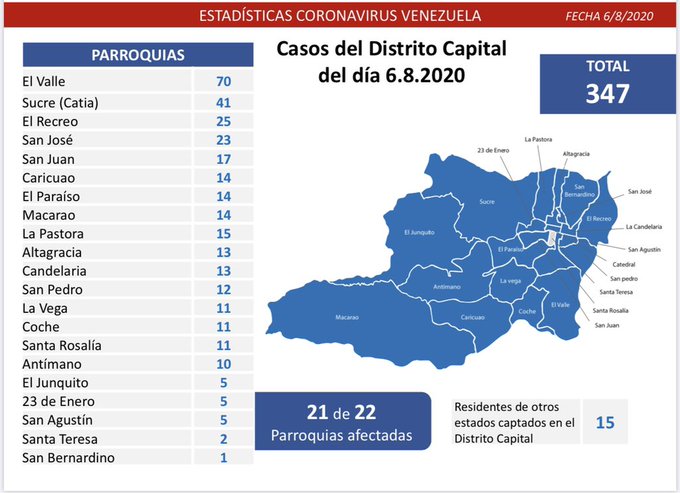 Informó que «el Distrito Capital continúa siendo la entidad con mayor cantidad de contagios (371), La mayoría de los casos se presentan en: El Valle(56), Catia (40), Altagracia (32). El virus se mantiene circulando en todas las parroquias de Caracas», explicó.