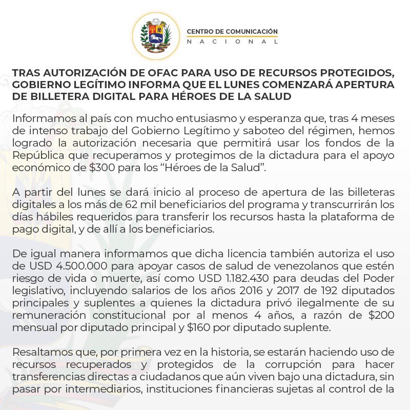 «¿En qué momento estamos? En la aprobación de los fondos. Viene a adelantar un proceso importante. Es primera vez que el Gobierno encargado va a poder hacer uso de la República para atender la emergencia», destacó en una transmisión por sus redes sociales.