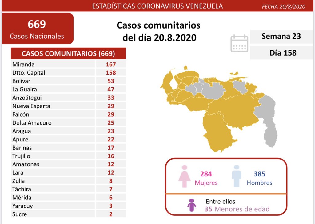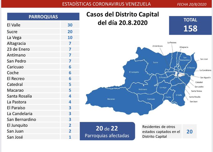 Indicó que la mayor cantidad de contagios se produjo en el estado Miranda (167), seguido por el Distrito Capital (158) con casos activos en sus 22 parroquias, entre ellas: El Valle (30), Catia (20) y La Vega (10).