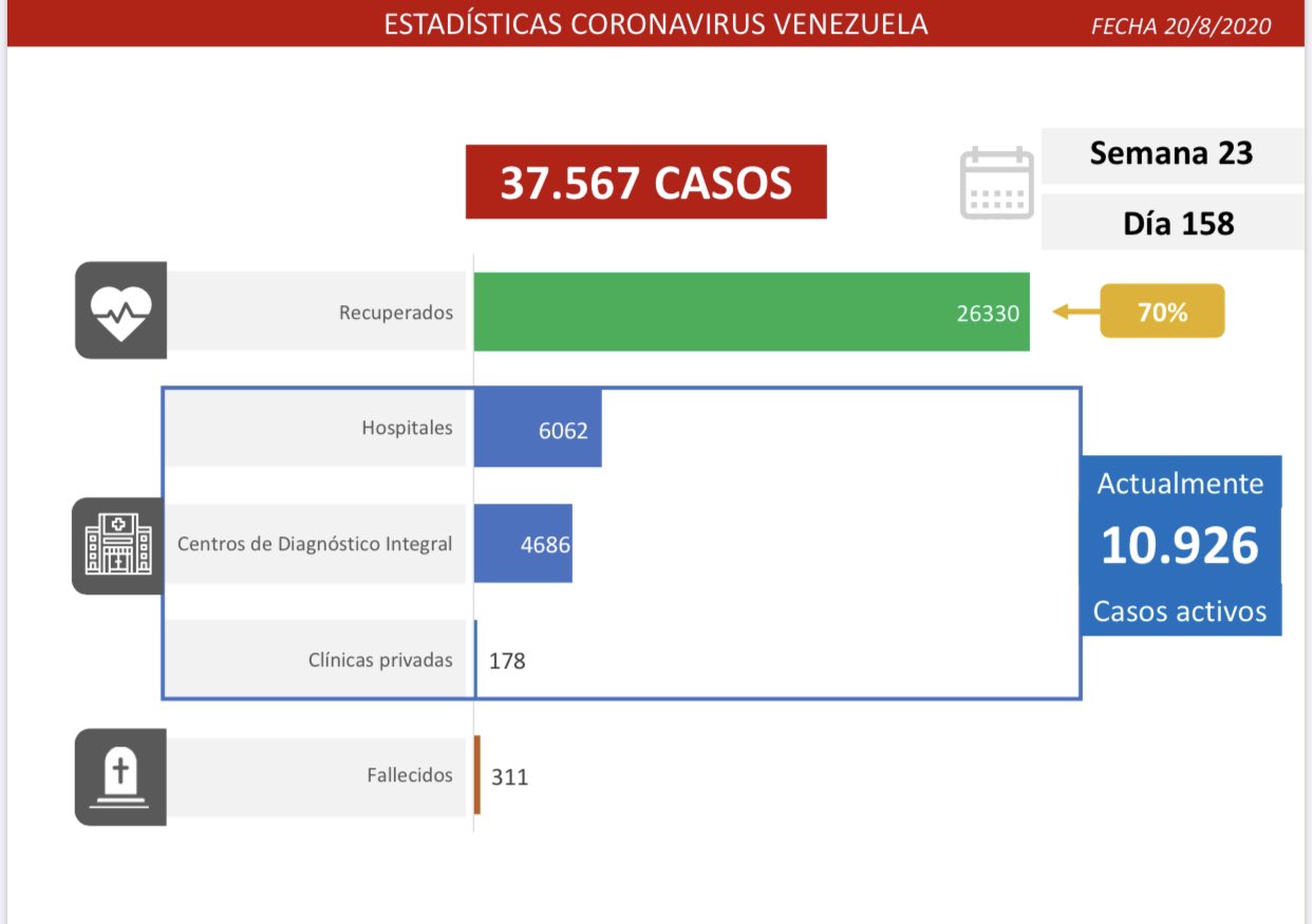 «En Venezuela se contabilizan 37.567 casos de COVID-19, de los cuales 10.926 se encuentran activos, 26.330 recuperados (70%), 6.062 están en Hospitales, 4.686 en CDI, 178 en Clínicas Privadas y la lamentable cifra de 311 fallecidos», informó.