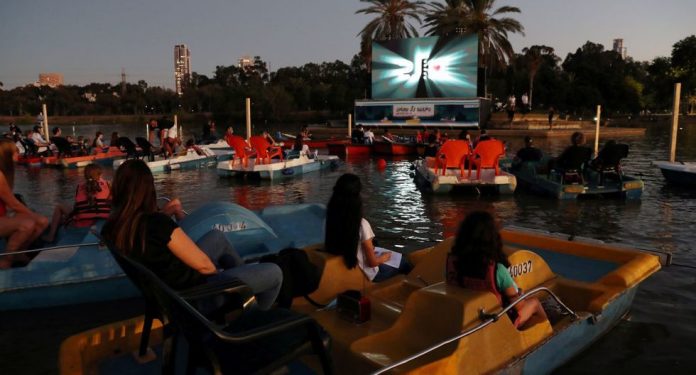En botes, a dos metros de distancia y bajo la luz de las estrellas, es una sala de cine versión covid-19 en Tel Aviv, donde algunos israelíes tendrán una experiencia de la que ha sido privado el país y gran parte del mundo en los últimos meses.