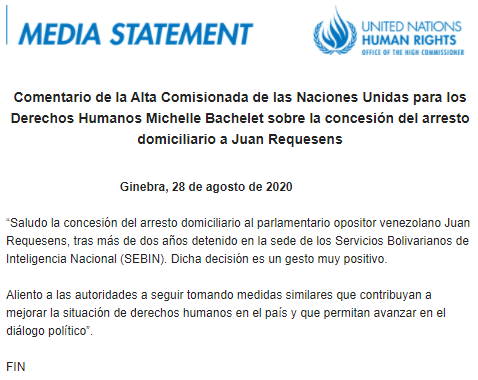 La oficina del Alto Comisionado de la ONU para los Derechos Humanos, encabezada por Michelle Bachelet, calificó como un gesto «positivo» la medida de casa por cárcel para el diputado Juan Requesens.