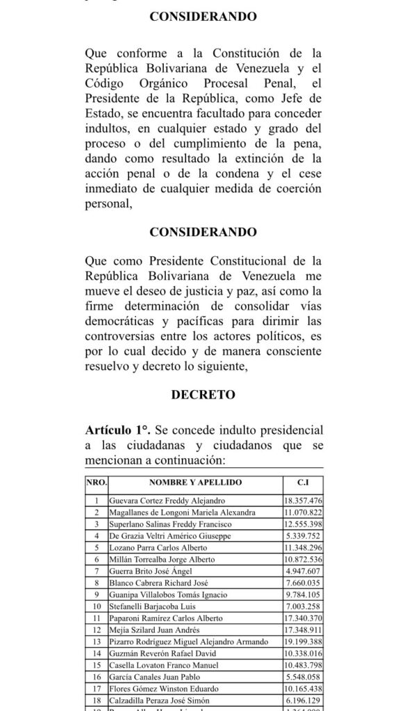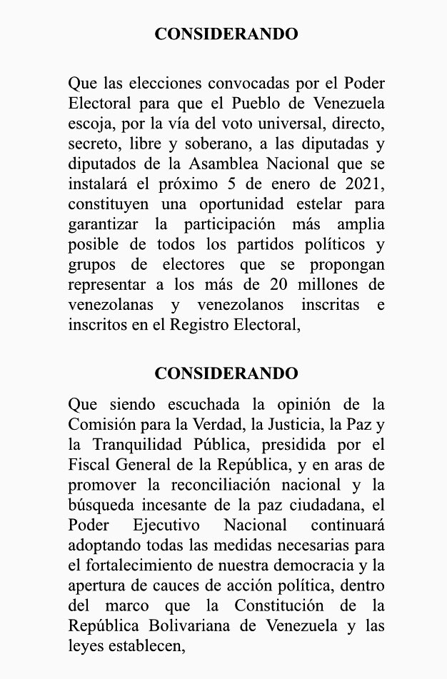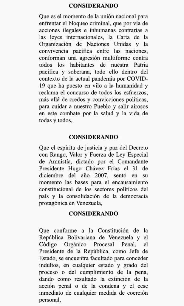 Que como presidente constitucional de la República Bolivariana de Venezuela me mueve el deseo de justicia y paz, así como la firme determinación de consolidar vías democráticas y pacíficas para dirimir las controversia entre los actores políticos, es por lo cual que decido, y de manera consciente resuelvo y decreto lo siguiente,