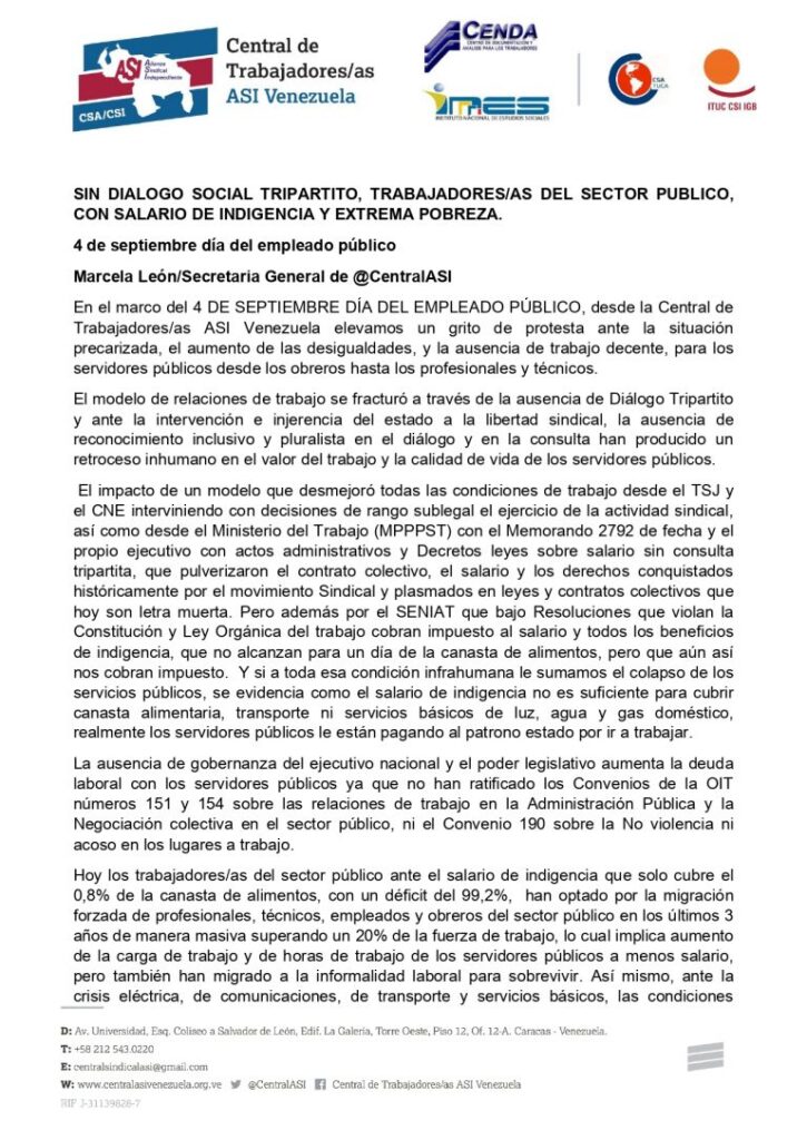 Marcela León, Secretaría General de la Central de Trabajadores Así Venezuela, calificó esta situación como «precaria por el aumento de las desigualdades y la ausencia de trabajo decente, desde los obreros hasta los profesionales y técnicos».