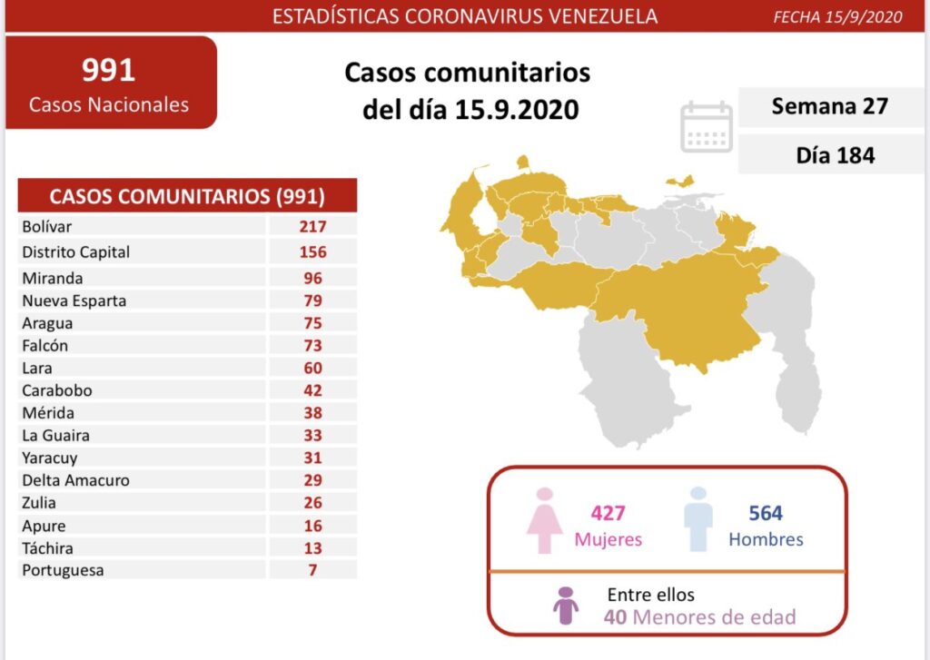 El estado Bolívar es la entidad que presenta mayor cantidad de contagios (217), seguida por Distrito Capital (156), Miranda (96), Nueva Esparta(79) y Aragua (75).