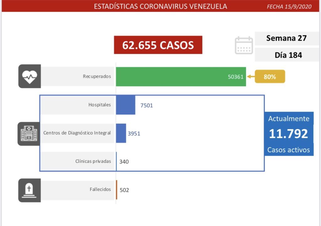 De esa cantidad de contagios 11.792 se encuentran activos, 50.361 recuperados (80%), 7.501 están en hospitales, 3.951 en CDI y 340 en clínicas privadas.