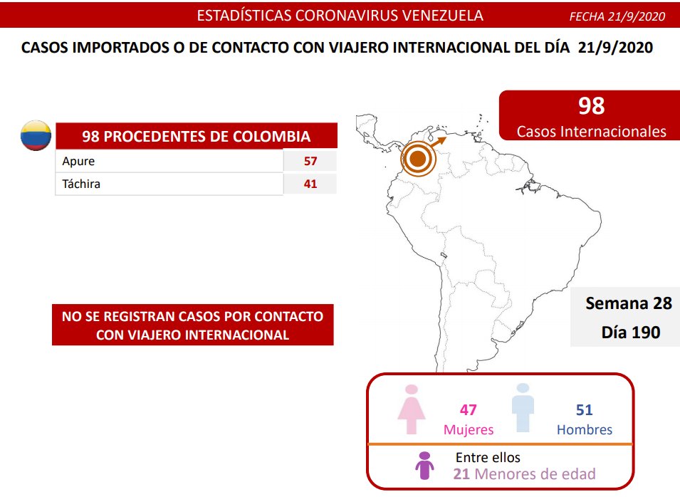 Se reportan 98 casos de transmisión fronteriza, provenientes todos de Colombia, que ingresaron desde el estado Táchira y Apure. De estos contagios, 51 son hombres y 47 son mujeres.