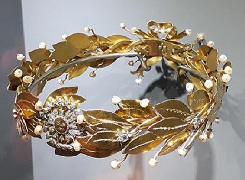 Una corona de laurel en oro, con 47 hojas entrelazadas, 23 en la sección derecha, 22 en la izquierda y dos en el centro; el frente adornado con un gran Sol figurado, con 60 chispas de diamante, 55 en los rayos interiores y 31 alrededor del rostro.