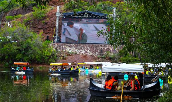 El vaso de la presa hizo de una sala de cine. Las butacas son pequeñas y enumeradas lanchas de madera en donde máximo pueden ir cuatro personas, todas con chaleco salvavidas y cubrebocas. Por función solo son permitidas 30 lanchas, 120 personas-.