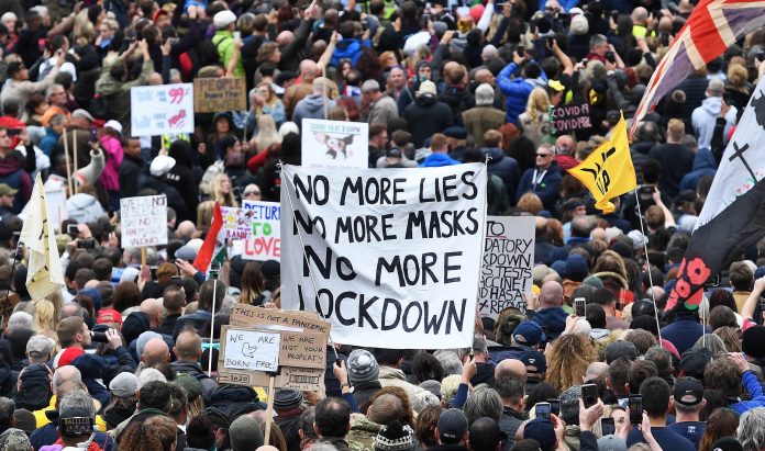 Miles de personas se reunieron el sábado en la Plaza de Trafalgar de Londres para protestar contra las medidas de confinamiento y distanciamiento social que las autoridades implementaron para frenar la propagación del covid-19.