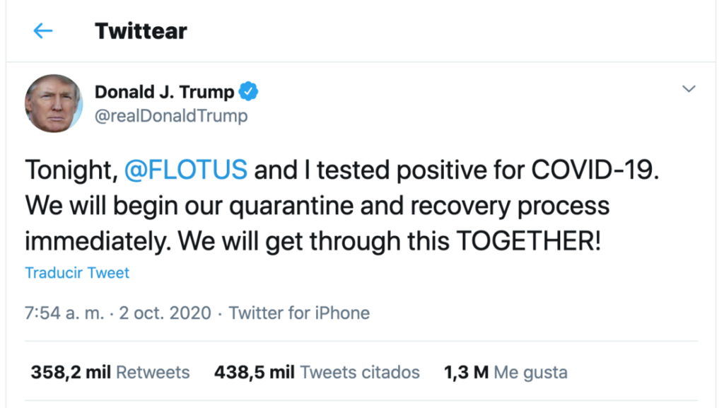 El mensaje del presidente de EEUU Donald Trump anunciando que tenía coronavirus batió récord en Twitter.