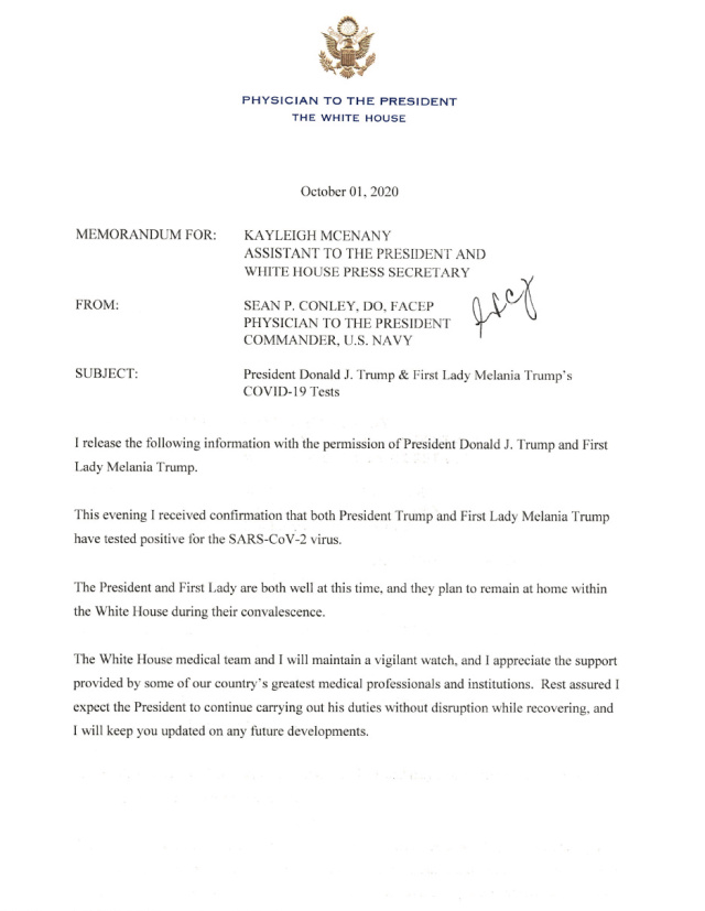 El presidente recibió este viernes una dosis de ocho gramos del cóctel experimental de anticuerpos de la farmacéutica Regeneron y sigue «fatigado pero con buen estado de ánimo» horas después de haber dado positivo por