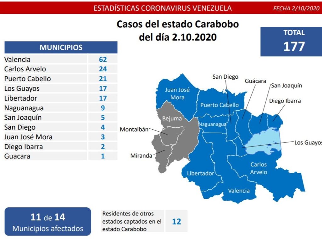Carabobo es la entidad con mayor número de contagios en los siguientes municipios: 62 Valencia, 24 Carlos Arvelo, 21 Puerto Cabello, 17 Los Guayos, 17 Libertado, 9 Naguanagua, 5 San Joaquín, 4 San Diego, 3 Juan José Mora, 2 Diego Ibarra y 1 Guacara.