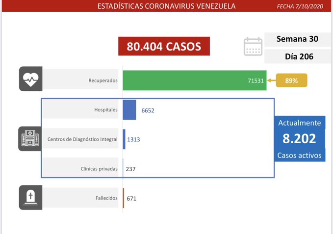 «En Venezuela se contabilizan 80.404 casos de COVID19, de los cuales 8.202 se encuentran activos, 71.531 recuperados (89%), 6.652 están en hospitales, 1.313 en CDI, 237 en clínicas privadas y la lamentable cifra de 671 fallecidos», informó a través de Twitter.