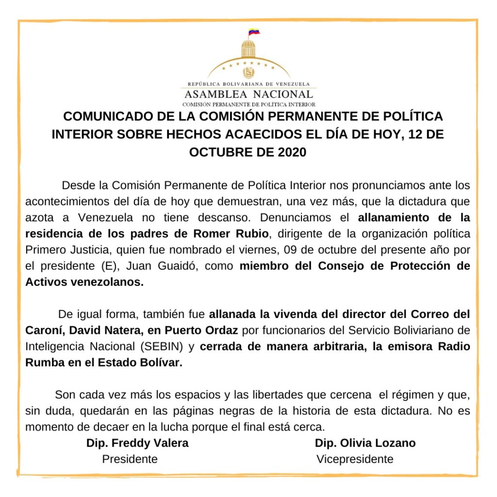 En comunicado, la Comisión de Política Interior, denunció que la «dictadura no tiene descanso», al atentar contra la oposición.