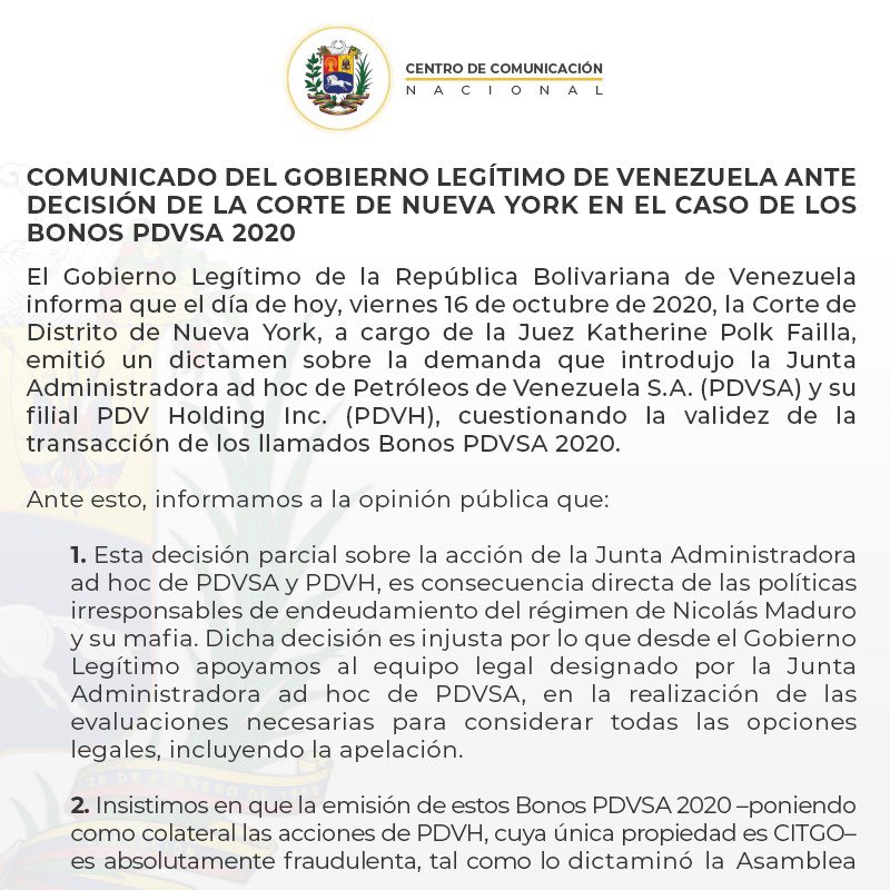 «Esta decisión parcial sobre la acción de la Junta Administradora ad hoc de PDVSA y PDVH, es consecuencia directa de las políticas irresponsables de endeudamiento del régimen de Nicolás Maduro y su mafia», señala el escrito publicado en las redes sociales del Centro de Comunicación Nacional.