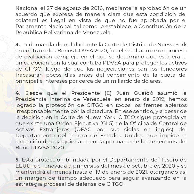 Agrega que «dicha decisión es injusta por lo que desde el Gobierno Legítimo apoyamos al equipo legal designado por la Junta Administradora ad hoc de PDVSA, en la realización de las evaluaciones necesarias para considerar todas las opciones legales, incluyendo la apelación».