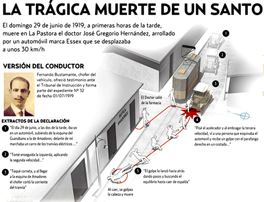 A las dos de la tarde del domingo 29 de junio de 1919 ocurrió el accidente que le costó la vida al doctor José Gregorio Hernández. A esa hora el médico trató d cruzar la calle en la esquina Los Amadores, en el preciso momento de circular por un extremo el tranvía y por el otro el auto Essex Super Six, conducido por Fernando Bustamante Morales, quien para entonces tenía 25 años de edad.