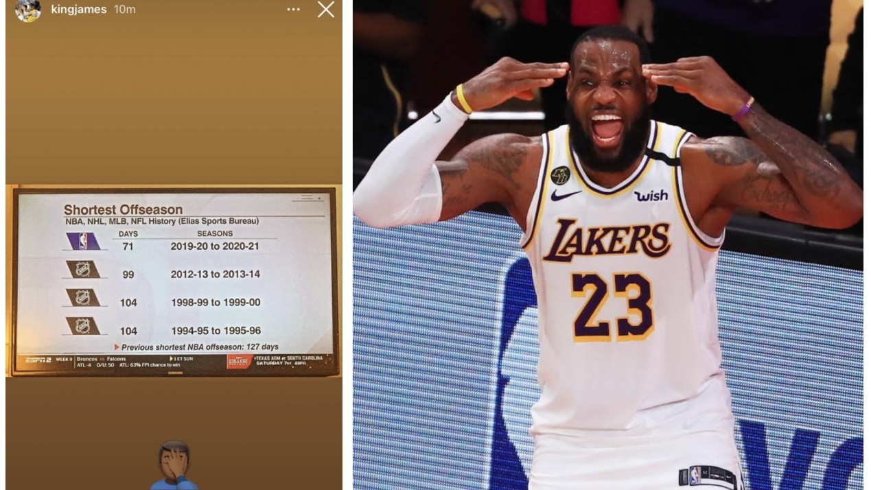 ‘King’ James no ocultó su malestar en las redes sociales, colgando en su Instagram el cuadro que demuestra que es el periodo de descanso más corto de descanso de la historia que afrontarán los jugadores, adjuntando junto al mismo un emoji llevándose la mano a la cabeza. Muy elocuente y sin utilizar una sola palabra.