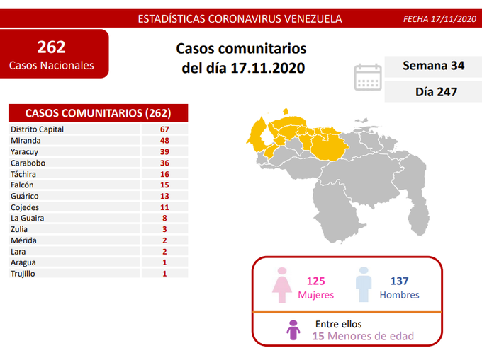 Los casos comunitarios están distribuidos de la siguiente manera: Distrito Capital 67, Miranda 48, Yaracuy 39, Carabobo 36, Táchira 16, Falcón 15, Guárico 13, Cojedes 11, La Guaira 8, Zulia 3, Mérida 2, Lara 2, Aragua 1, Trujillo 1.