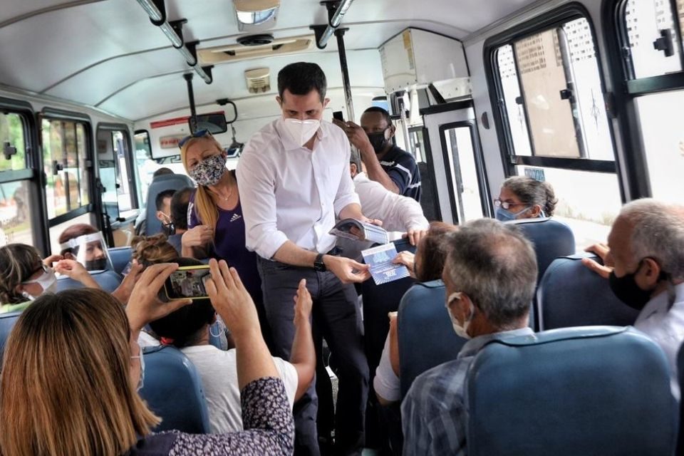 Guaidó abordó varios autobuses, de distintas rutas de Caracas, para entregar volantes a los pasajeros, responder preguntas y recordar la importancia de la unión y la participación en los próximos días.