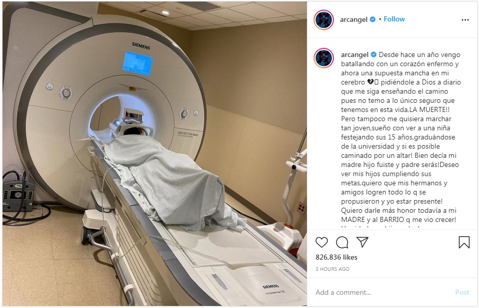El reguetonero Arcángel informó a través de sus redes sociales que está siendo sometido a estudios tras la detección de una «presunta mancha» en su cerebro.