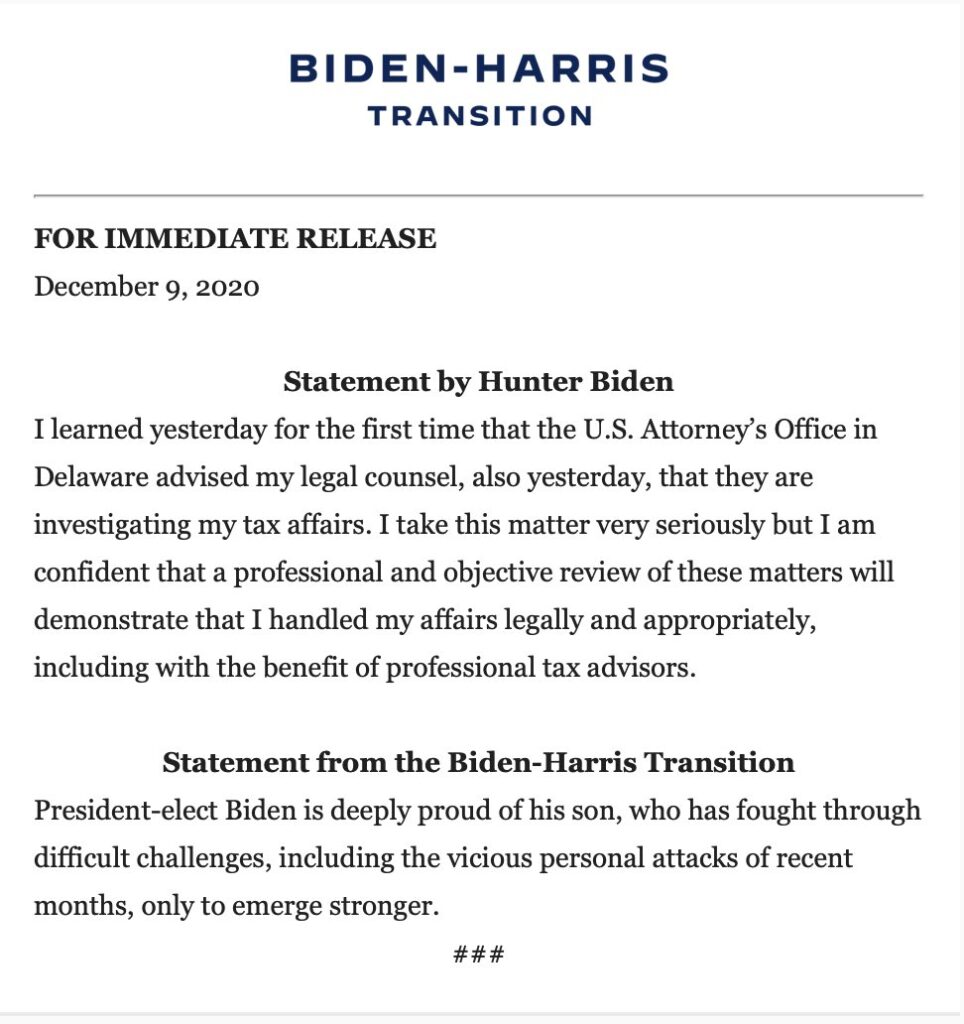 En el mismo escrito, el equipo de transición de Biden aseguró que el presidente electo «está extremadamente orgulloso de su hijo, quien ha tenido que enfrentar terribles desafíos, incluidos viles ataques personales de los últimos meses, solo para salir fortalecido».