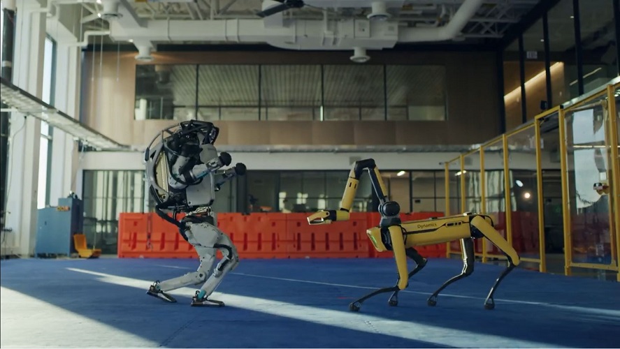 Al cabo de un rato se suma el famoso modelo cuadrúpedo Spot. El robot perro salta y mueve sus extremidades en total coordinación a la vez que sigue la coreografía junto con los otros dos robots Atlas. La plataforma base de Spot proporciona movilidad y percepción avanzadas para moverse por escaleras y terreno irregular, mientras recopila información en 2D y 3D gracias a sus sensores integrados.