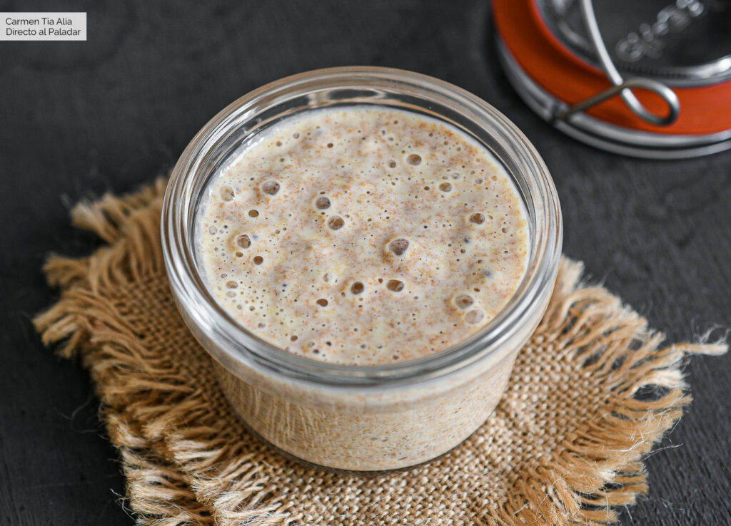 En el segundo día añadimos medio vaso de harina de fuerza y de agua y una cucharadita de azúcar. Removemos y dejamos reposar por otras 24 horas.