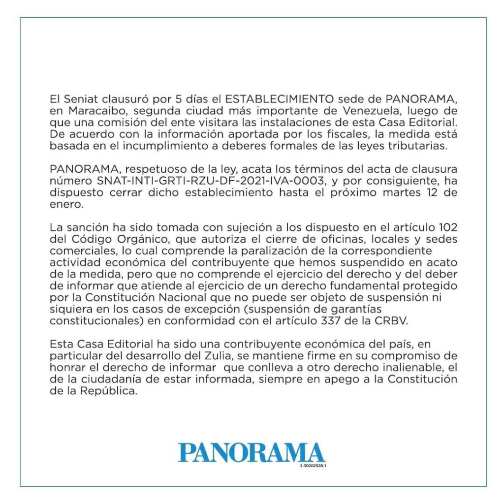 A través de un comunicado, el diario Panorama informó que el Seniat lo clausuró por 5 días, debido a faltas en materia tributaria.